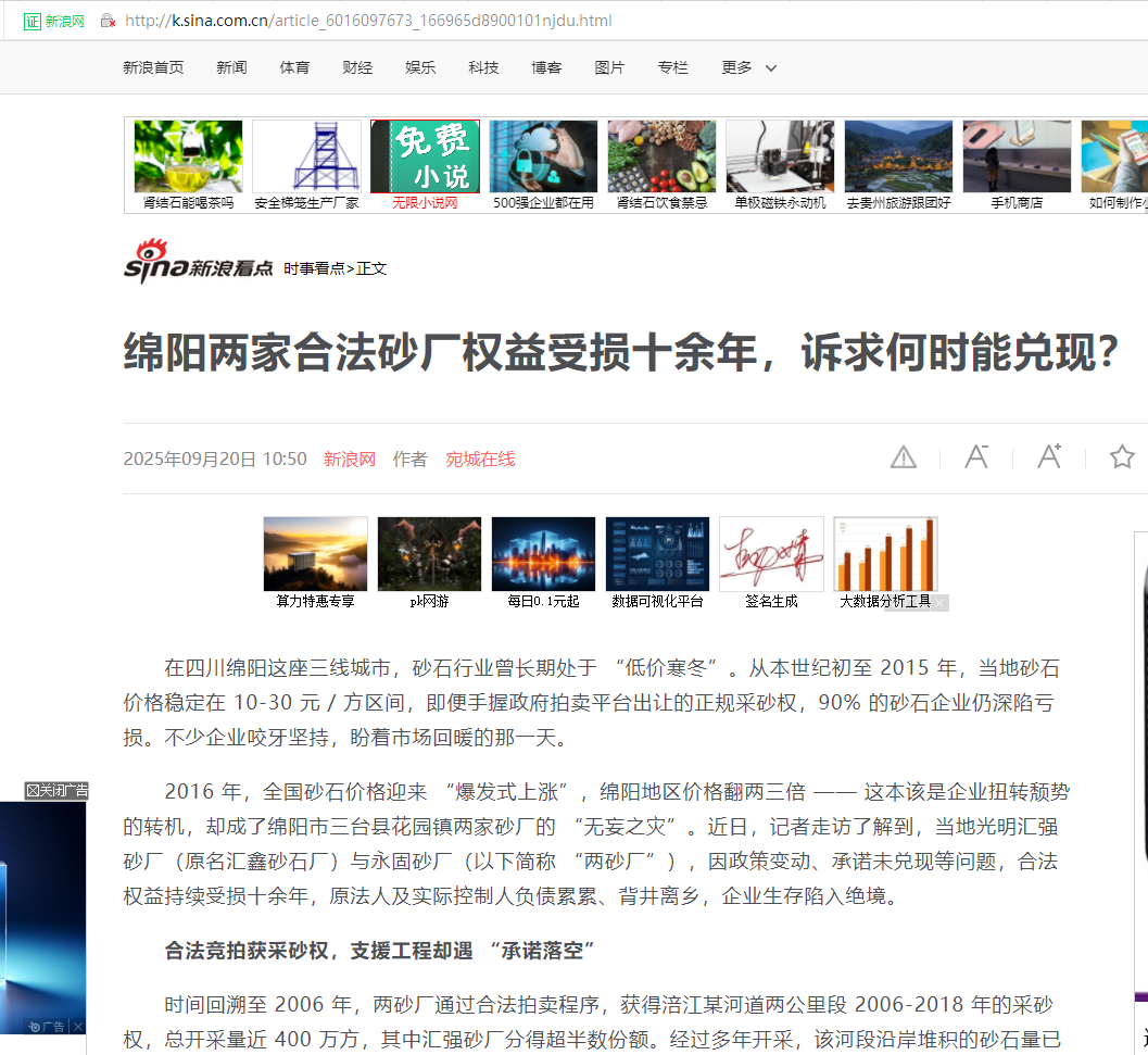 企业诉求明确:盼依法处置原料、解决补偿 记者了解到,两砂厂已收集齐拍卖文件、政府承诺记录、盖章手续、缴费凭证等相关证据,并愿意对所有陈述承担法律责任。目前企业的诉求清晰且迫切:依据《物权法》规定,允许企业自行处理合法开采期间堆积的砂石料,用所得资金偿还债务、维持基本生存;同时希望政府依法依规、公平公正处理厂区拆除后的补偿问题。 “从 2017 年到现在,我们找水利局沟通了无数次,问题始终没解决。” 负责人无奈地说。 绵阳两砂厂的遭遇,是三线城市民营企业在政策变动与市场波动中艰难求生的一个缩影。从 “低价寒冬” 中咬牙坚持,到价格上涨时盼来希望,再到因政策执行偏差陷入 “无妄之灾”,十余年时间里,两家合法经营的企业从 “有厂有料” 沦为 “无址无业”,原经营者负债背井离乡,这样的结局令人唏嘘,更值得深思。 期待三台县相关部门能正视历史遗留问题,主动对接企业,以 “实事求是” 的态度厘清责任,以 “依法依规” 的行动兑现承诺,还企业一个公道,让背井离乡的经营者能早日回家,让市场看到地方政府保障民营企业权益的诚意与担当。