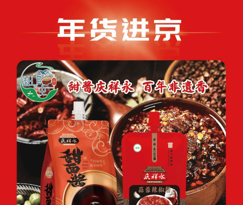 香飘京城,年味传万家 为全面推进乡村振兴,促进非遗农产标准化、精品化发展,北京地铁1号线新春“年货进京”主题巡展中,赵官屯“庆祥永”酱品凭借百年非遗底蕴、地道运河风味与过硬产品品质,成功入围上榜,成为静海农产的代表名片。春节期间,庆祥永系列酱品亮相北京地铁1号线,让首都市民在浓浓年味中邂逅运河边的百年酱香,感受天津非遗美食的独特魅力。这是百年酱园的品牌新征程,也是乡村特色产业与城市消费市场的双向奔赴,见证着赵官屯以非遗文化为翼,让本土好物走出静海、香飘全国的坚实步伐。