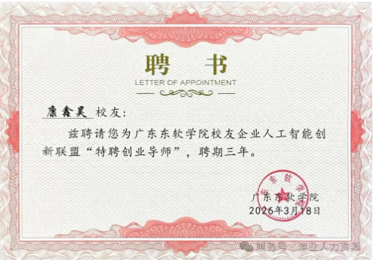 康鑫昊先生获聘东软人工智能学院特聘创业导师,是认可,更是责任。澳业人力资源将立足自身深耕湾区人力服务的专业积淀,深度参与东软 AI 人才培育与创业孵化工作,为学子和创业团队送上实打实的支持与指导: ✅ 聚焦 AI 创业团队人才搭建痛点,分享产业人才需求趋势,指导创业团队根据项目定位做好核心人才布局、制定科学的人才招聘与培养策略,让技术团队适配创业发展节奏; ✅ 结合佛山南海本地及大湾区产业特点,为 AI 创业项目提供本土化人才匹配建议,助力创业团队快速对接区域优质人力资源,降低人才获取成本; ✅ 融入东软 “校企融合八协同” 与实践教学体系,参与创业实训、命题揭榜等活动,从人力视角为创业项目把脉,让项目更贴合产业实际、更具落地性; ✅ 开放澳业人力的企业资源网络,为东软 AI 创业团队对接湾区优质合作企业、产业资源,搭建创业项目与市场需求的对接桥梁,助力项目从校园走向市场。